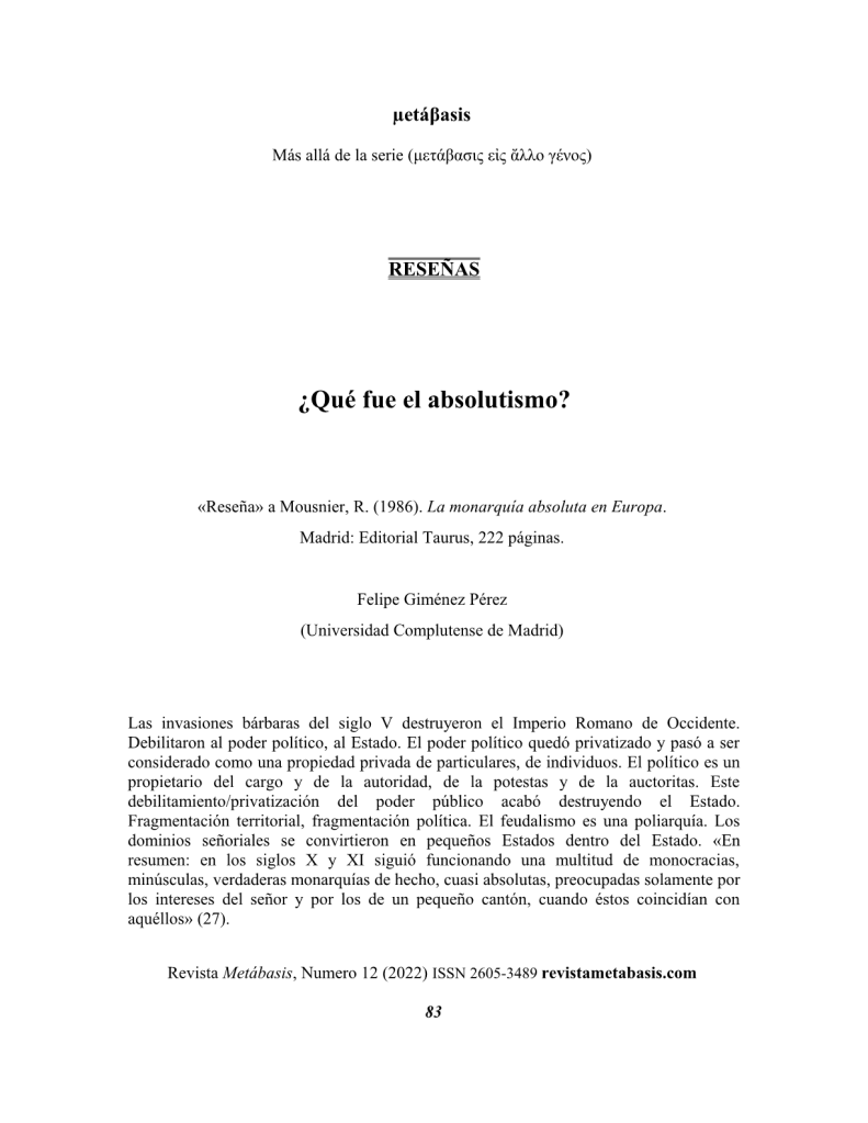 Giménez Pérez, F. (2022). Qué fue el absolutismo. «Reseña» a Mousnier, R. (1986). La monarquía absoluta en Europa. Madrid: Editorial Taurus, 222 páginas.