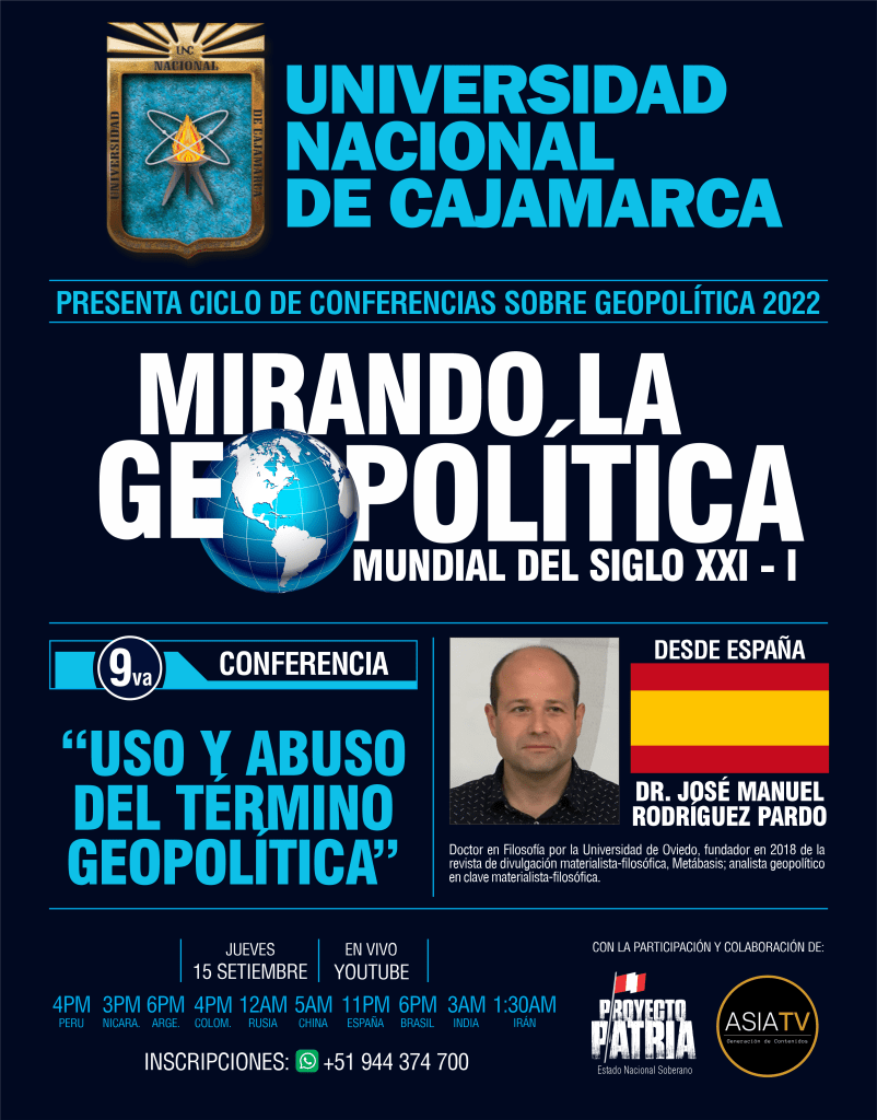 Uso y abuso del término Geopolítica. Conferencia impartida dentro del ciclo «Mirando la Geopolítica mundial del siglo XXI» organizado por la Universidad de Cajamarca, Perú, y auspiciado por el canal de Youtube Humo y Espejos Jueves, 15 de Septiembre de 2022