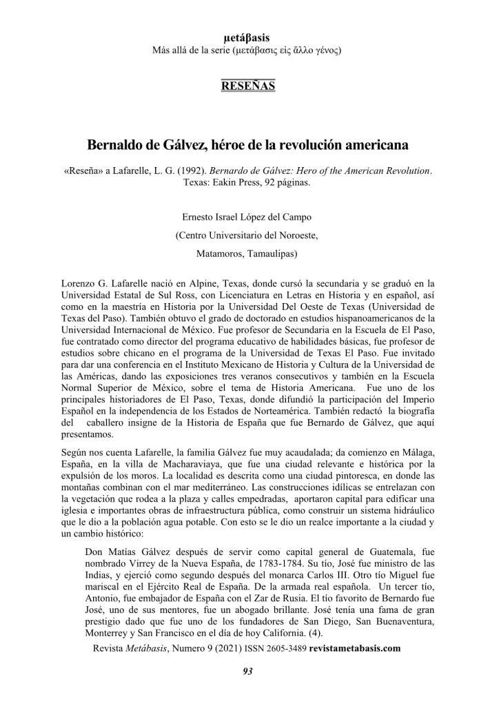 «Reseña» a Lafarelle, L. G. (1992). Bernardo de Gálvez: Hero of the American Revolution.
