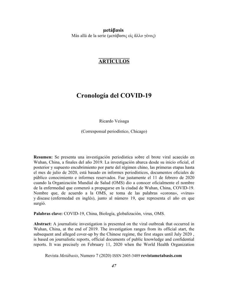 Cronología del COVID-19 Veisaga, R. (2020), Cronología del COVID-19. Revista Metábasis, Nº 7, 47.82. revistametabasis.com ISSN 2605-3489 Comparte: Compartir en X (Se abre en una ventana nueva) X Comparte en Facebook (Se abre en una ventana nueva) Facebook Compartir en LinkedIn (Se abre en una ventana nueva) LinkedIn Compartir en Reddit (Se abre en una ventana nueva) Reddit Compartir en Tumblr (Se abre en una ventana nueva) Tumblr Haz clic en Pinterest (Se abre en una ventana nueva) Pinterest Compartir en Pocket (Se abre en una ventana nueva) Pocket Compartir en Telegram (Se abre en una ventana nueva) Telegram Compartir en WhatsApp (Se abre en una ventana nueva) WhatsApp Enviar un enlace a un amigo por correo electrónico (Se abre en una ventana nueva) Correo electrónico Me gusta Cargando...