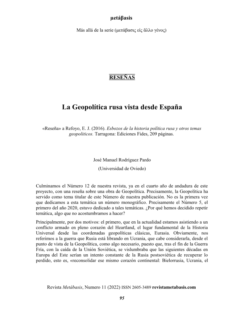 Rodríguez Pardo, J. M. (2022). La Geopolítica rusa vista desde España. «Reseña» a Refoyo, E. J. (2016). Esbozos de la historia política rusa y otros temas geopoliticos. Tarragona: Ediciones Fides, 209 páginas. Revista Metábasis, Nº 12, 95-102.
